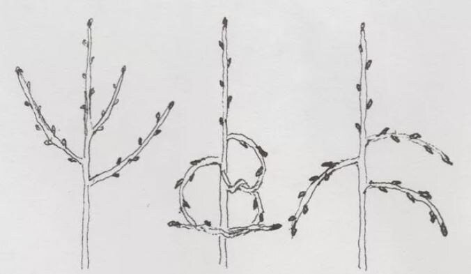 После закручивания спустя 1–2 месяца можно ослабить или вовсе снять фиксатор: побег сохранит заданную форму. Ожидается, что на следующий год такая ветка начнет плодоносить. Если побег пытается вновь выпрямиться, можно повторить процедуру или провести прищипку верхушки.