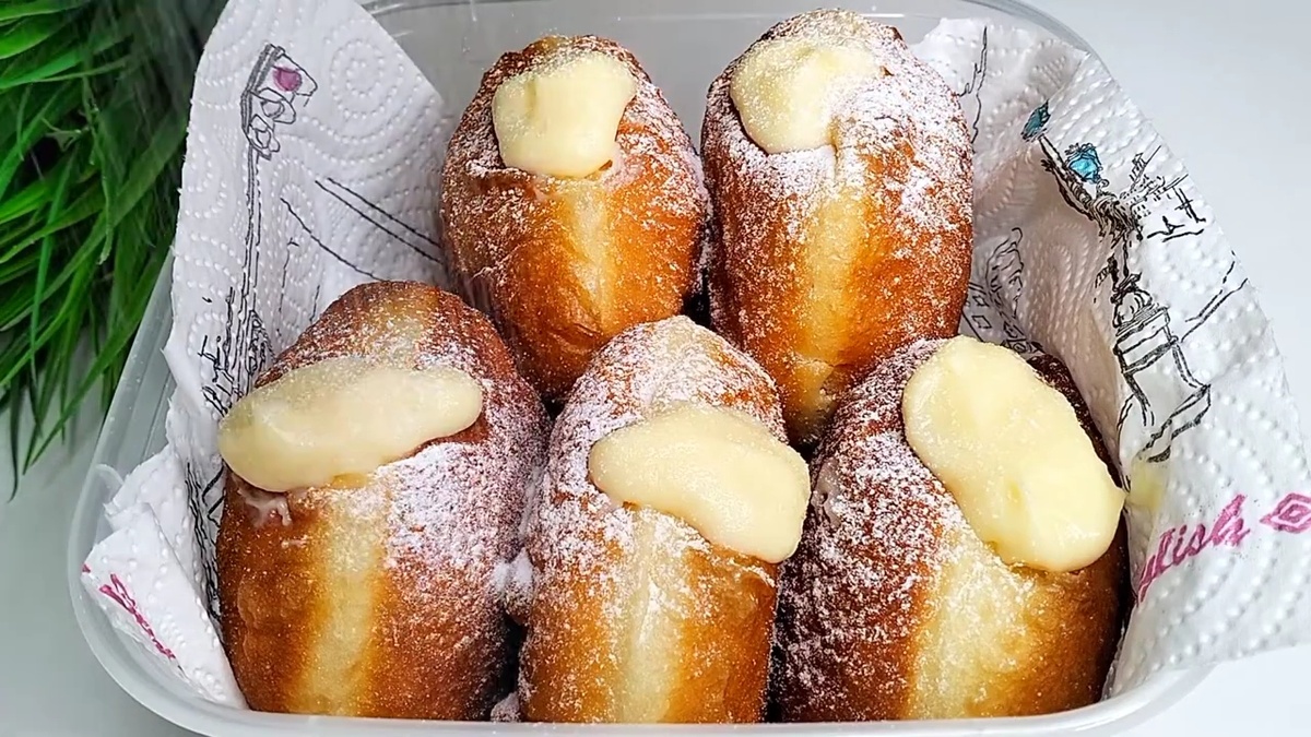 В глубокой сковороде разогреть растительное масло и обжаривать пончики до золотистого цвета по три минуты с каждой стороны на среднем огне. После жарки, когда пончики остынут, сделать небольшое отверстие и заполнить их заварным кремом. Завершить процесс можно, посыпав сахарной пудрой.