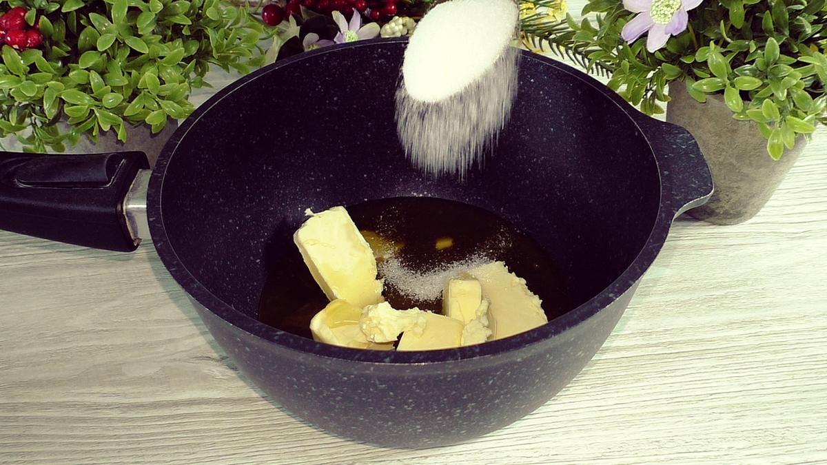 Сначала необходимо растопить сливочное масло и смешать его с медом и сахаром, нагревая эту массу в кастрюле до полного растворения, но не доводя до кипения. После охлаждения смеси до комнатной температуры можно продолжать дальше.