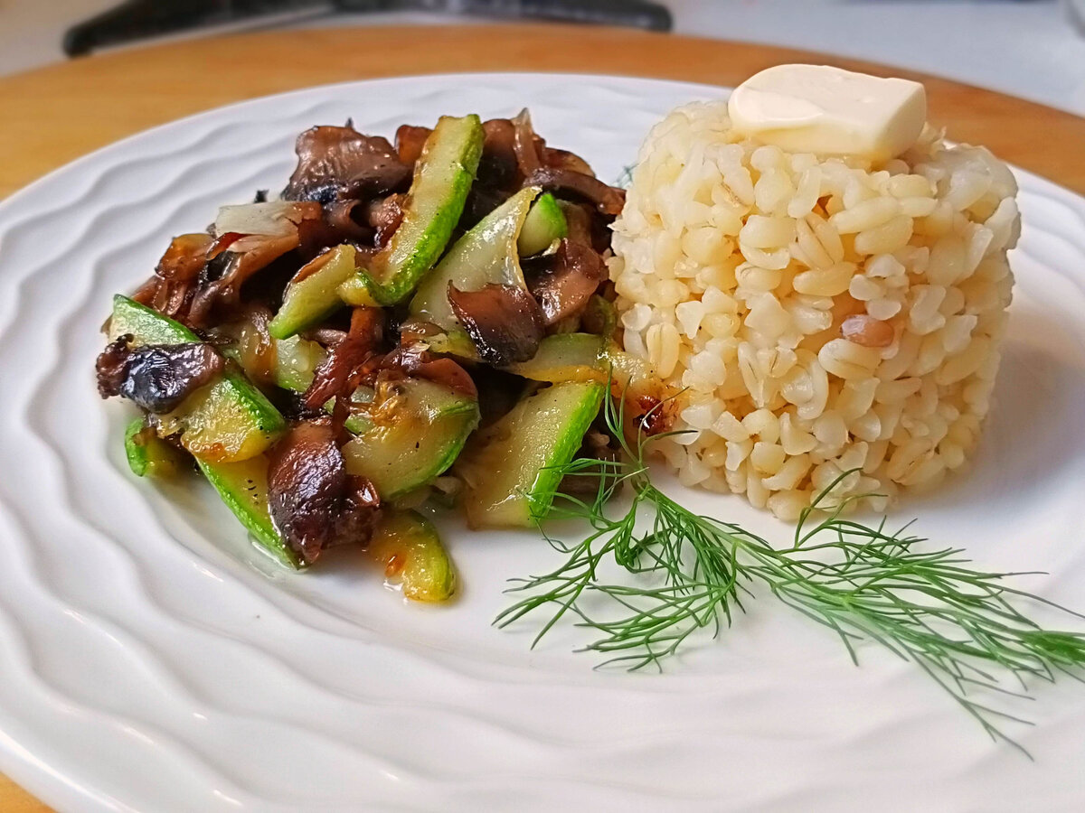 На тарелках красиво разместите булгур и жареные цукини с грибами. Для подачи можно использовать кофейную чашку, чтобы сделать сервировку более интересной.