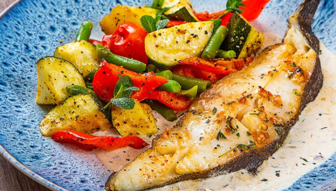Шаг 7: Подавайте стейки палтуса на тарелках с запечёнными овощами и соусом мятный биск, наслаждаясь богатством вкусов!