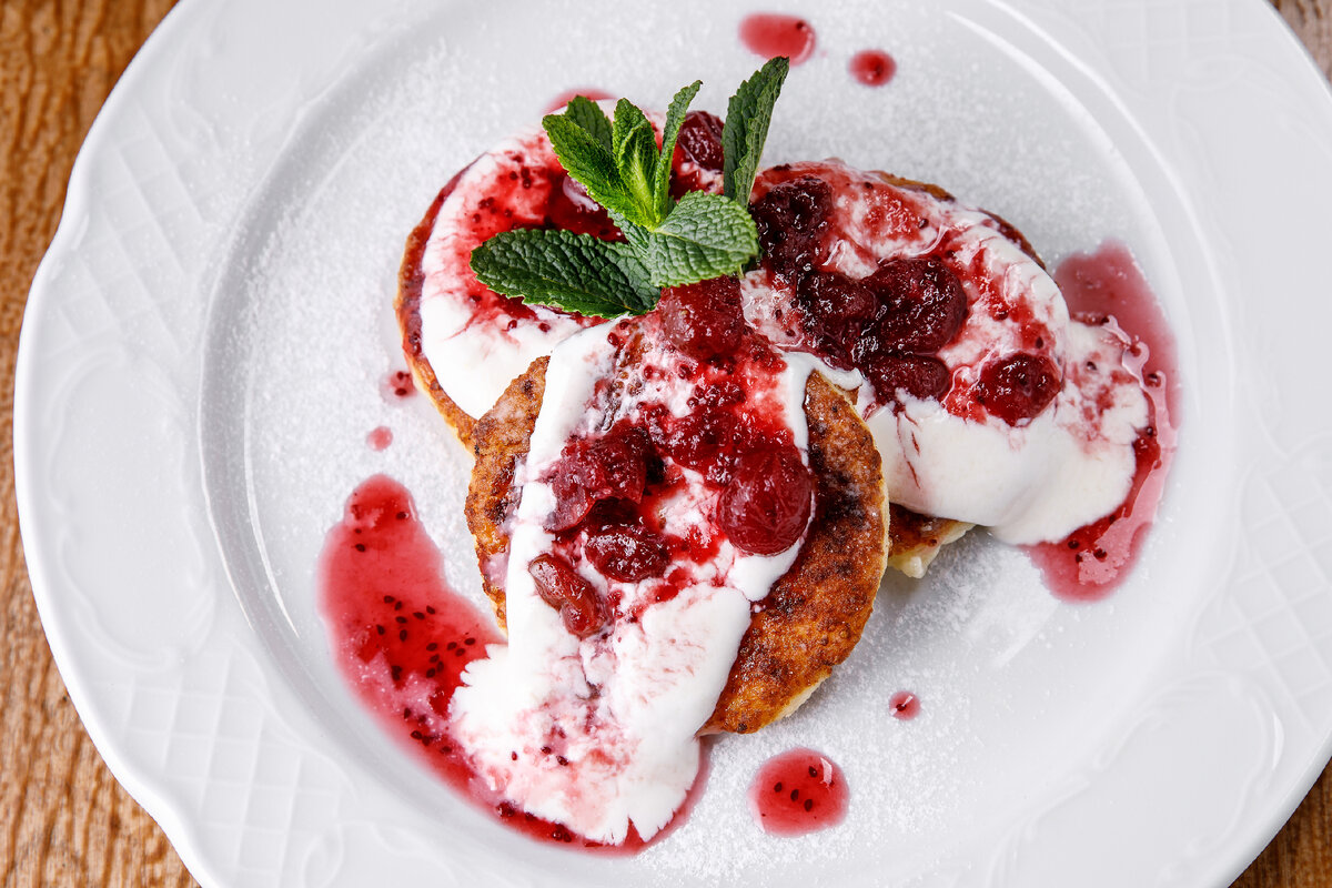 Эти сырники подаются горячими, политыми вишневым конфитюром и украшенными свежей мятой. Отличный завтрак, который понравится всем без исключения! Идеальное сочетание с чаем или кофе.