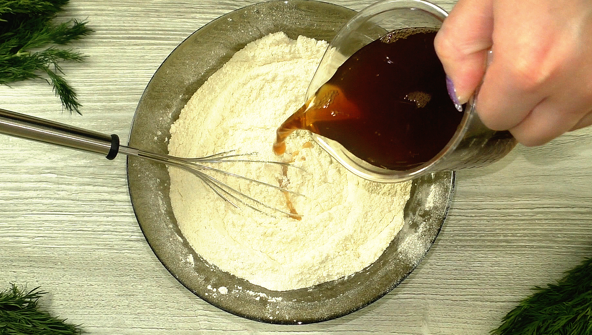 Сначала просеять муку с разрыхлителем, добавить сахар и хорошо перемешать для равномерного распределения ингредиентов. Затем влить остывший крепкий чай, варенье и растительное масло. Замесить тесто и вылить его в форму, предварительно застеленную бумагой для выпечки.
