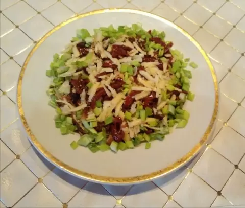Нарежьте зелёный лук и посыпьте им салат. Вот и всё — ваша вкуснота готова!