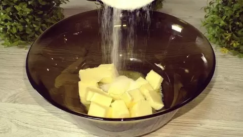 В глубокой миске мягкое сливочное масло соединяется с солью и сахаром. Смешайте ингредиенты с помощью миксера или лопатки до однородной массы. Затем введите творог и тщательно перемешайте.