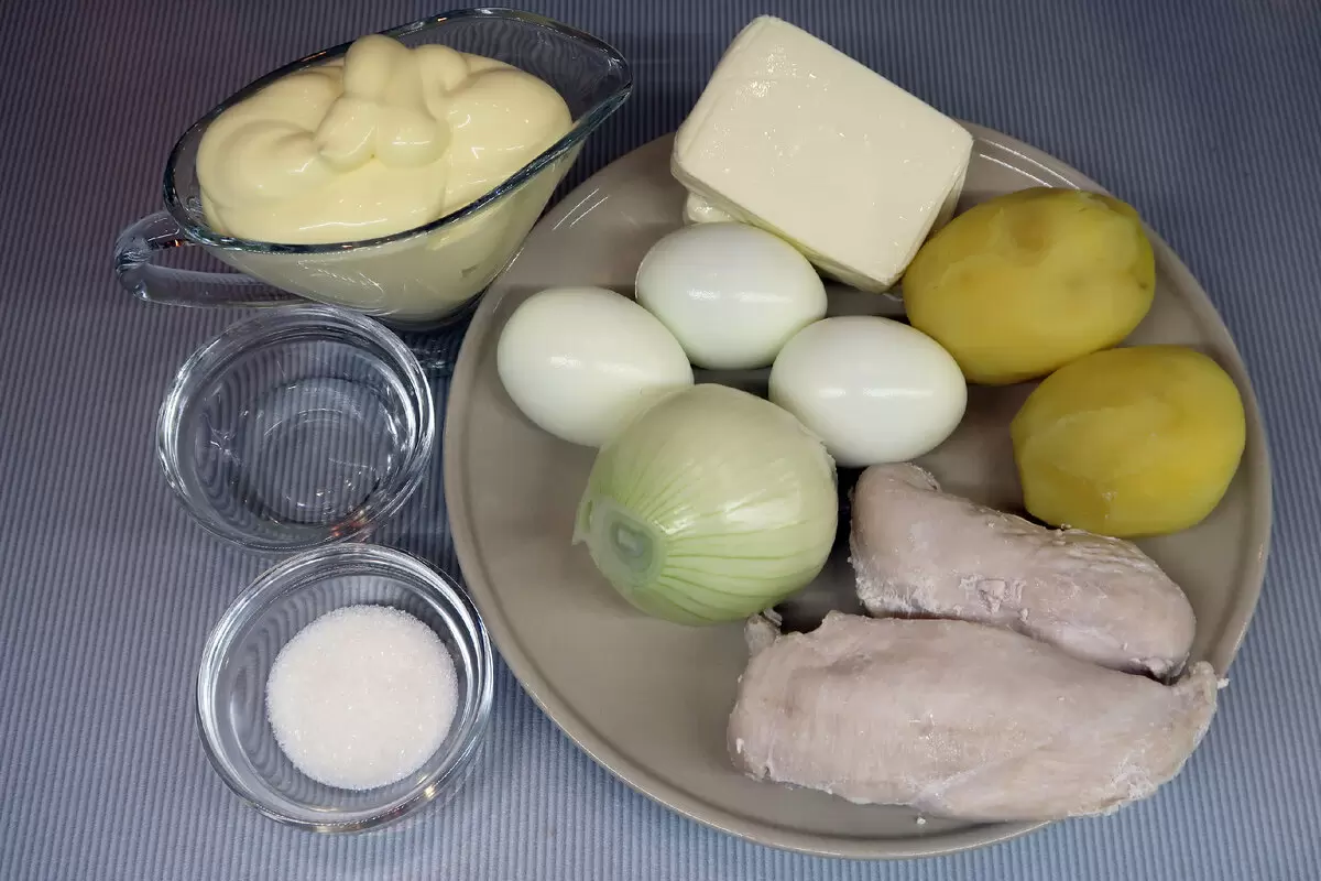 Тем временем, нарезать куриное филе на маленькие кусочки, отварить картошку и натереть её на средней терке. Яйца также подготовить: отделить желтки от белков, натерев желтки на мелкой терке, а белки — на крупной. Плавленые сырки удобно натереть, предварительно поместив их в морозильник на 30 минут.