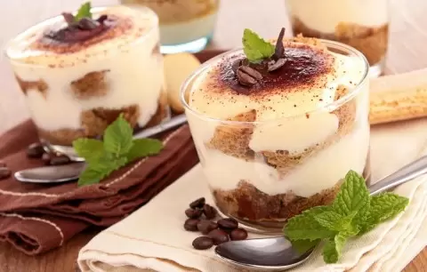 - Тирамису в стаканчиках: Легко адаптивный итальянский десерт, который можно подать в стильных порционных стаканах. Внутри — слои крема из маскарпоне и пропитанные кофе печенья савоярди. Идеально подходит для тех, кто ценит сочетание сладости и терпкости.