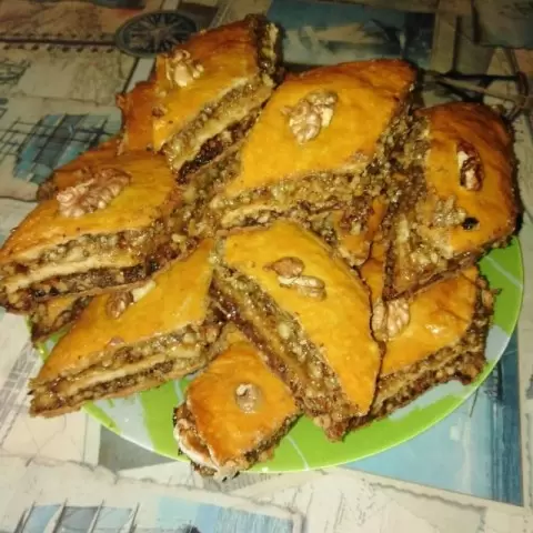- Пахлава: 500 г муки, 200 г сметаны, 300 г сливочного масла, 2 яйца, 1 ч. ложка разрыхлителя, 200 г орехов (по выбору), 2 стакана сахара, 1 ст. ложка пряностей (корица, кардамон), 50 г меда.
