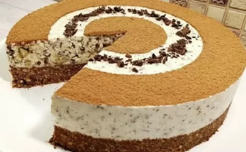 Затем в крем добавляется растопленный желатин, 80-90 граммов халвы, нарезанные грецкие орехи и тертый шоколад по вкусу. Получившуюся массу выкладывают на застывшую основу и разравнивают. Для украшения можно посыпать торт какао-порошком и тертым шоколадом. Форму помещают в холодильник на 2-3 часа для полного застывания.