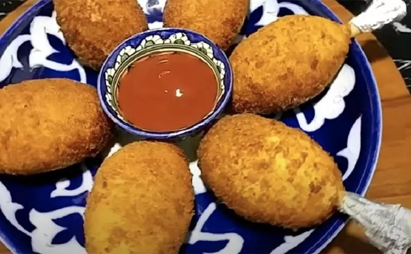 Полученную массу делим на 9 равных частей и формируем из каждой шарик. На каждую порцию насаживаем отложенные куриные кости, чтобы придать котлетам форму. Затем обмакиваем их в взбитое яйцо, обваливаем в муке, снова в яйце и, наконец, в панировочных сухарях.