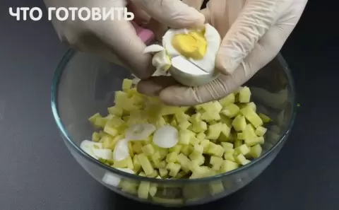 Следующим шагом станет сыр. Его стоит порезать на небольшие кубики. Нельзя забывать и о вареных яйцах — их также нужно мелко нарезать и отправить в общую массу.