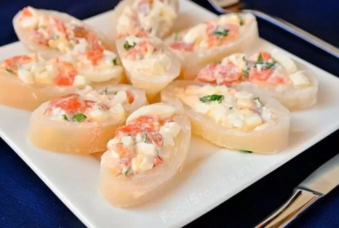 Сначала рекомендуется отварить яйца до готовности. После охлаждения их следует мелко нарезать кубиками, удобно использовать яйцерезку.Семгу порезать на небольшие кусочки, стараясь сохранить такой же размер, как и яичные кубики.Зелень также нужно измельчить, лучше всего подойдет свежая петрушка.В глубокой миске объедините куриные яйца, семгу и зелень. Все заправьте майонезом, а при желании можно добавить немного соли для вкуса.Тушку кальмара необходимо быстро отварить всего 30-60 секунд: важно, чтобы она осталась нежной и не стала резиновой.Когда кальмар будет готов, начините его подготовленной смесью.Теперь нарежьте фаршированный кальмар на кольца толщиной около 1 сантиметра и подавайте на стол.Это блюдо порадует гостей и знакомых своим необычным вкусом и эффектной подачей. Приятного аппетита!