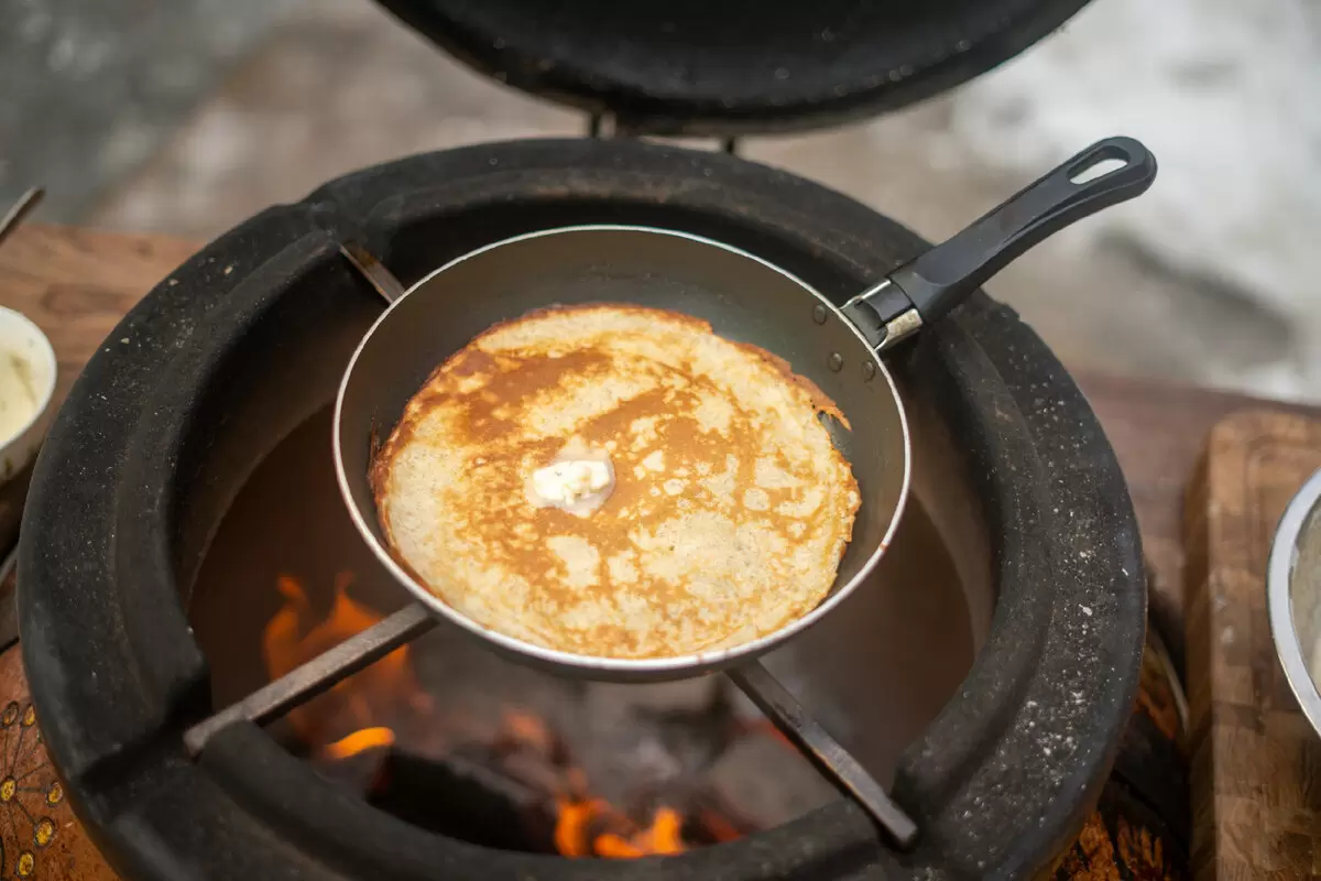 Когда тесто готово, для смазывания сковороды используется половинка репчатого лука или картошки, натертой на вилку и обмакнутой в растительное масло. Далее сковорода ставится на огонь: если используется тандыр, она устанавливается на крестовину, чтобы жар был равномерным.