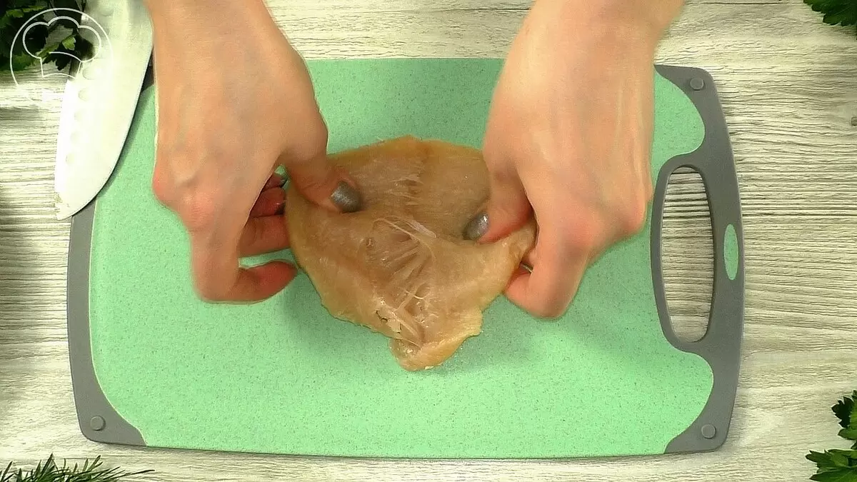 Для начала подготовьте куриное филе: разрежьте грудку на кусочки, сделав их чуть тоньше, чтобы они быстрее прожарились. Размер этих кусочков — по вашему усмотрению.