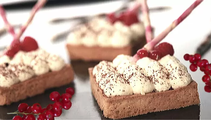 Смешайте мягкое сливочное масло с сахаром и добавьте миндальную муку, яйца и пралине. Перемешайте до однородности и аккуратно введите взбитые сливки. Получившуюся смесь выложите в тарталетки и выпекайте 10 минут при температуре 180° C.
