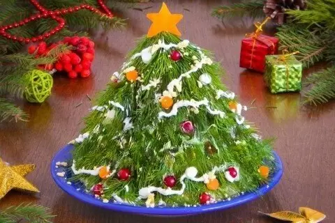Оформить салат можно очень оригинально. Из оставшейся половины моркови с помощью специального инструмента вырезаются маленькие шарики и звезда. Сам салат выкладывается в форме конуса, а зелень укропа используется для создания «елочных лапок». Завершая оформление, на верхушку ставится морковная звездочка, а вокруг обвязывается майонез. Ягоды клюквы и морковные шарики добавят яркости и контраста.