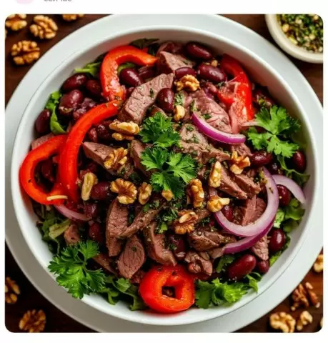 Салат Тбилиси в любое время покоряет сердца гурманов своим насыщенным вкусом и гармонией ароматов. Это замечательное сочетание нежной говядины, сытной фасоли, свежих овощей и зелени живописно украсит как праздничный стол, так и скромный семейный ужин. Сегодня предложен классический рецепт этого салата, который легко воспроизвести в домашних условиях.