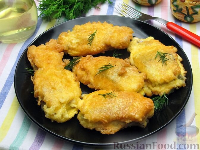 Еще один вариант, который стоит попробовать, — минтай в сырно-яичном кляре. Филе маринуется с кориандром и зирой, а затем обжаривается в кляре из яиц и тёртого сыра. Результат — золотистая хрустящая корочка и очень нежное внутри мясо.