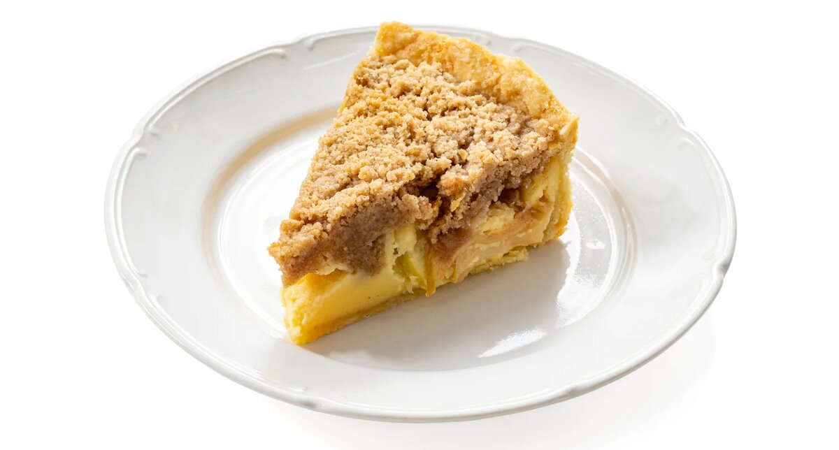 Тонко нарезанные яблоки разместите на основе, а затем залейте их кремом. Возвратите пирог в духовку на 30 минут, пока начинка не станет ровной. Для крамбла смешайте оставшиеся 100 г масла, 150 г муки, 50 г сахара и корицу. Рассыпьте крошку сверху и выпекайте на протяжении 20–25 минут.