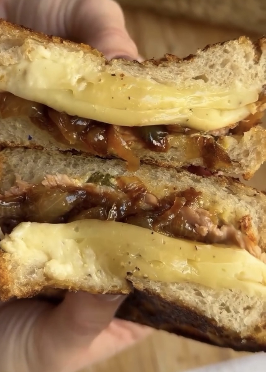 3. Сборка и жарка сэндвича. На сыр положите карамелизированный лук и ветчину. Закройте сэндвич, обжарьте на сливочном масле с обеих сторон на медленном огне, накрыв крышкой, чтобы сыр расплавился.
