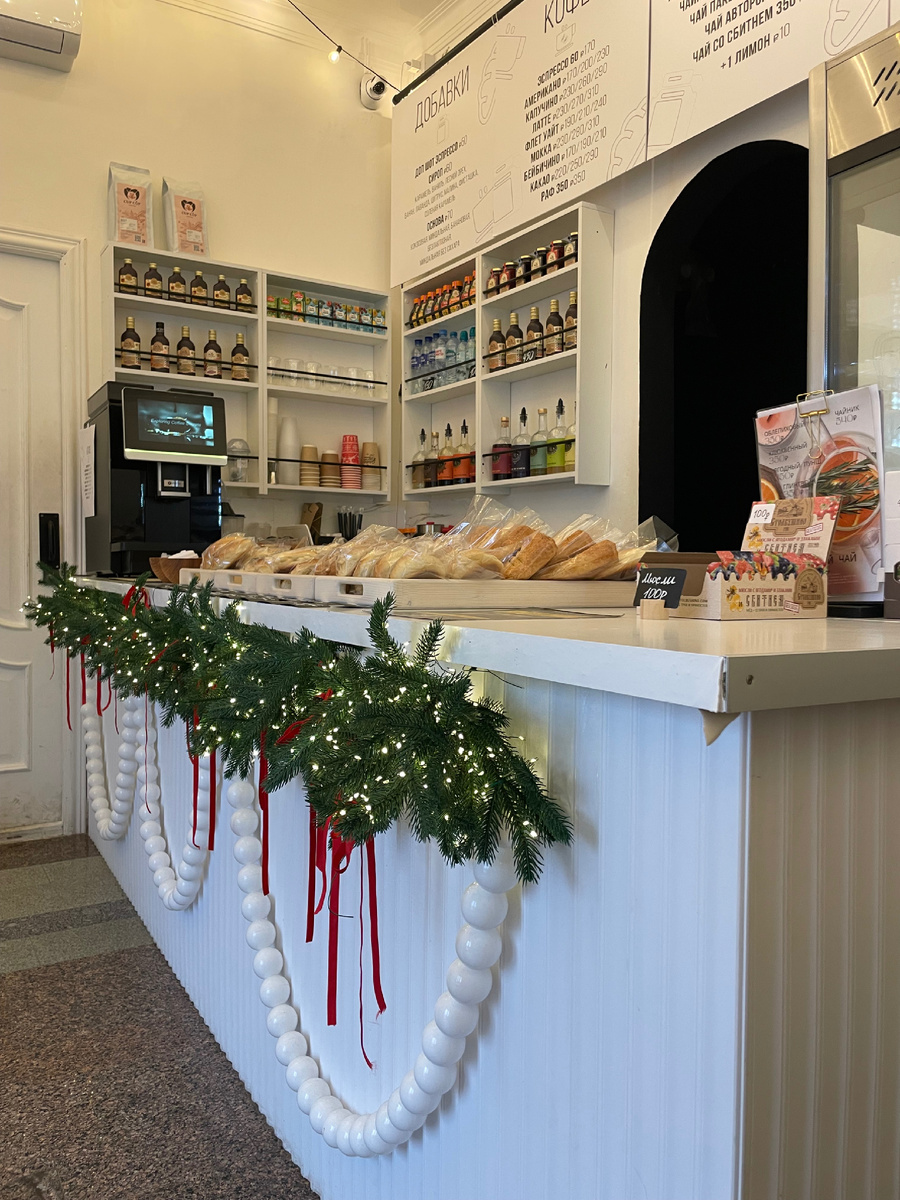 В этой маленькой кофейне царит теплая атмосфера: белоснежные стены, вдохновляющие надписи, красивые витрины с разнообразной выпечкой, а также милое освещение создают особый вайб для хорошего настроения. Внутри всего три столика, вмещающих 2-3 человека каждый, но благодаря этому место кажется ещё более уютным. Рядом – большое зеркало и арочная дверь, превращающая пространство в светлое и просторное.