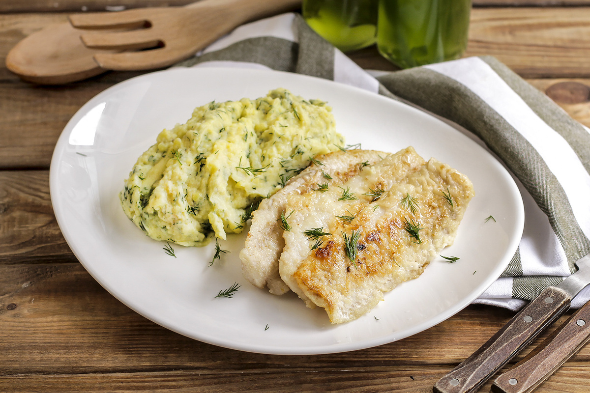 Шаг 3: В картофельное пюре добавьте укроп с чесноком, отрегулируйте вкус солью и перцем. Перемешайте и подавайте рыбу горячей на стол вместе с пюре. Это блюдо, без сомнения, станет настоящим хитом на вашем ужине, восхищая как семью, так и гостей.