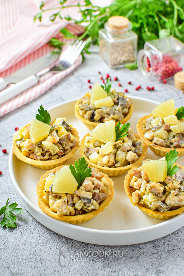 Тарталетки – настоящая находка для любого праздника. Они привлекают своим видом и невероятно вкусной начинкой, что неминуемо радует гостей. Сочетание ананасов с грибами и курицей создает гармонию вкусов, позволяя вам насладиться каждым укусом. Эти хрустящие корзиночки идеально подойдут для новогоднего стола, вызывая восторг у всех присутствующих.