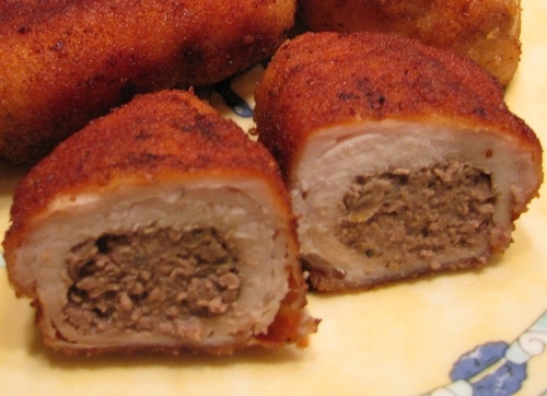 На каждом отбитом филе выкладывается 1-2 столовые ложки печеночной начинки, филе сворачивается в конверт, а края тщательно прижимают. Для панировки яйца взбиваются с небольшим количеством молока и солью. Каждая котлета обваливается в муке, затем в яичной смеси и, наконец, в сухарях или натертом белом хлебе.