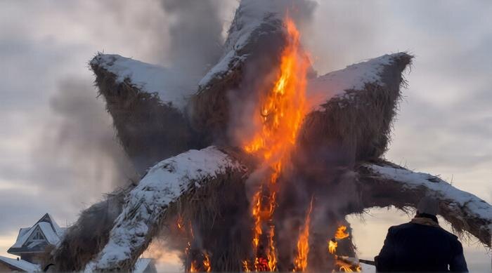 На Масленицу в Свердловской области произошло необычное событие — финальным аккордом праздника стало сжигание огромного цветка. Изображение охваченного пламенем чучела привлекло внимание зрителей, собравшихся на мероприятия. Этот цветок, по замыслу организаторов, имел связь с известной легендой Павла Бажова о «Каменном цветке». У некоторых зрителей он даже вызвал ассоциации с пауком Арагогом из популярных книг о Гарри Поттере.