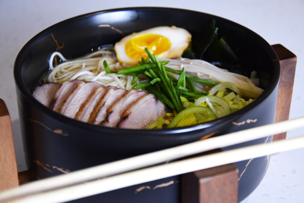 Ищете что-то новое? Рамен обязательно удивит поклонников азиатской кухни. В этот суп обычно добавляют маринованные яйца, но можно использовать и обычные вареные. Этот вариант включает утиные грудки, лапшу, грибы "эноки" и водоросли "вакаме". Бульон и лапша составляют основу, а остальное можно варьировать по своему желанию.