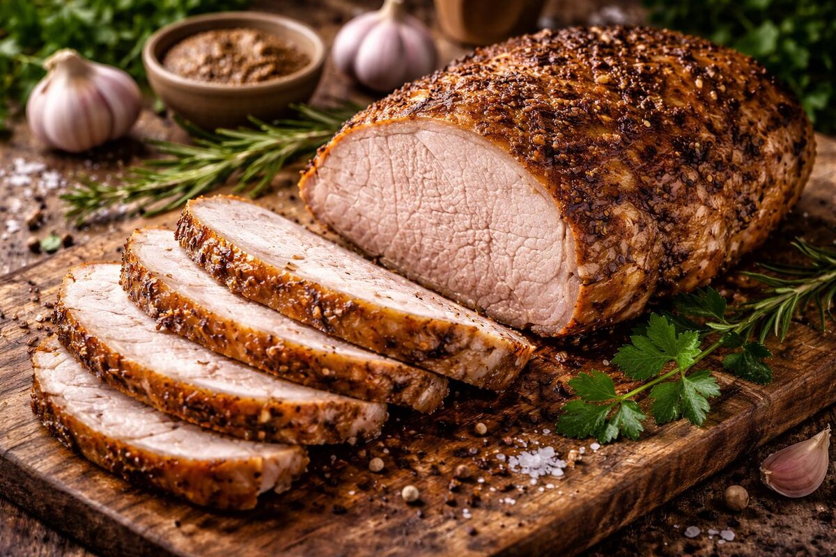 Лучше всего использовать свиную шею или окорок, выбирая цельный кусок без костей весом около 1,2–1,5 кг. Наличие небольших жировых прожилок приветствуется: они делают мясо более сочным. Важно помнить, что слишком постный кусок может получиться сухим, а чрезмерно жирный будет слишком тяжёлым. Идеальный вариант — упругий кусок с умеренной мраморностью.