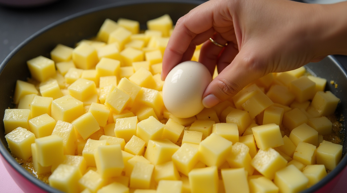 Пока картофель жарится, в отдельной миске разбиваются 4 яйца, в них добавляется щепотка соли, перца и копчёной паприки. Массу нужно тщательно перемешать.