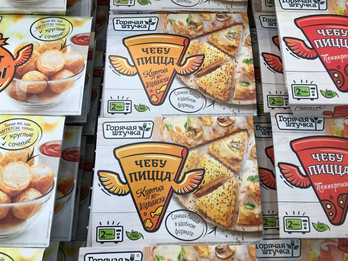 На лицевой стороне упаковки красуется аппетитный рисунок классической пиццы в сочетании с кусочками чебупиццы. Продукт продавался со скидкой: вместо 179 рублей его цена составила всего 99 рублей.
