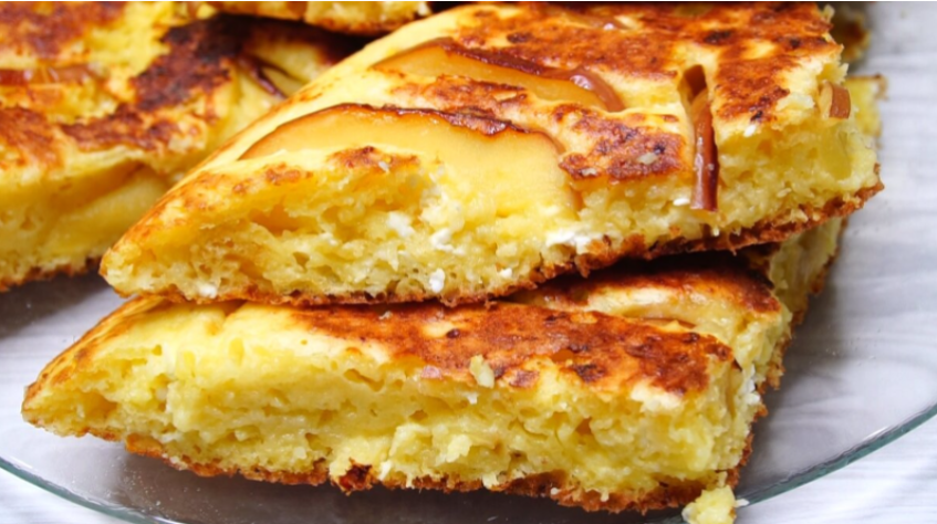 На заранее смазанной маслом сковороде распределите тесто равномерно, сверху уложите яблочные дольки. Накройте сковороду крышкой и готовьте на маленьком огне. Время приготовления — около 15 минут, пока лепешка не поднимется и не подрумянится снизу. Аккуратно переверните ее на тарелку и продолжайте готовить еще 10 минут под крышкой.
