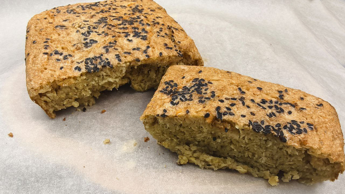 Для приготовления необходимо замочить 200 граммов красной чечевицы на пару часов, затем слить воду и добавить 2 яйца. Далее ввежите 100 мл греческого йогурта (или кефира), 10 г разрыхлителя и 2 ст.л. оливкового масла, посолите и пробейте всё погружным блендером до однородной массы. Не забудьте посыпать сверху кунжутом.