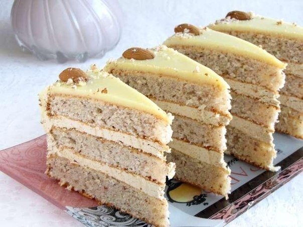 На финальном этапе сборки торта необходимо промазать два бисквитных коржа кремом, затем уложить их друг на друга и накрыть третьим коржом. Бока также покрываются кремом, а верх торт обливается глазурью и аккуратно выравнивается. При желании бока можно украсть миндальной крошкой, и завершить оформление орехами. Оставить торт в холодильнике на 2 часа, чтобы он остыл и пропитался.
