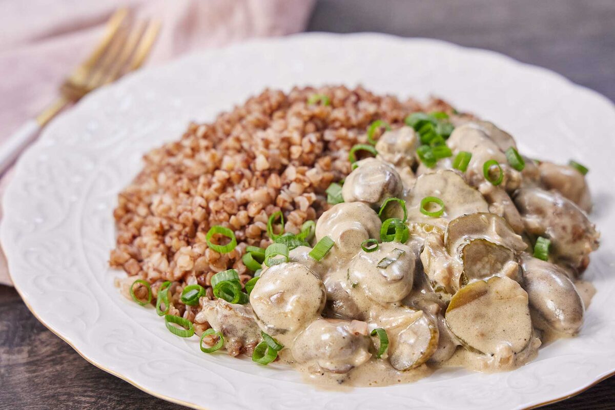 - На тарелку выложить гречку, рядом разместить чикен-харт-строганов.
