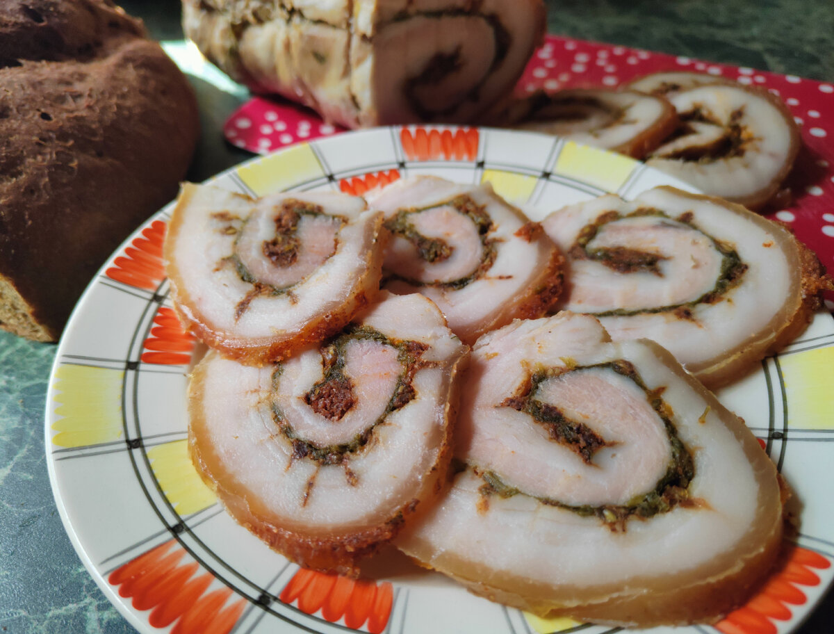 7. Когда рулет полностью остыл, его разворачивают, убирают лишний вытопившийся жир и нарезают. Подают на ломтиках ржаного хлеба – идеальное сочетание для наслаждения вкусом!