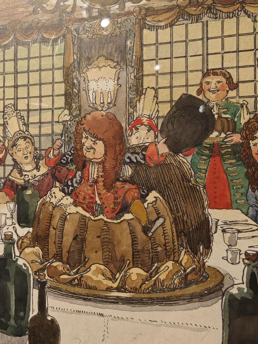 Александр Бенуа питал особую страсть к эпохе XVIII века, выбирая в своих работах не повседневную жизнь, а торжественные сюжеты, в которых чувствуются вдохновение и величие. Тем не менее, выставка не обошла стороной и гастрономическую сторону жизни Бенуа. Среди представленных материалов можно увидеть листы из его знаменитой "Азбуки", которые явно показывают его интерес к кулинарии: на одном изображении карлик вылезает из нарезанного паштета, на другом дети восхищаются пряничным домиком, а на третьем – весело уплетают еду.