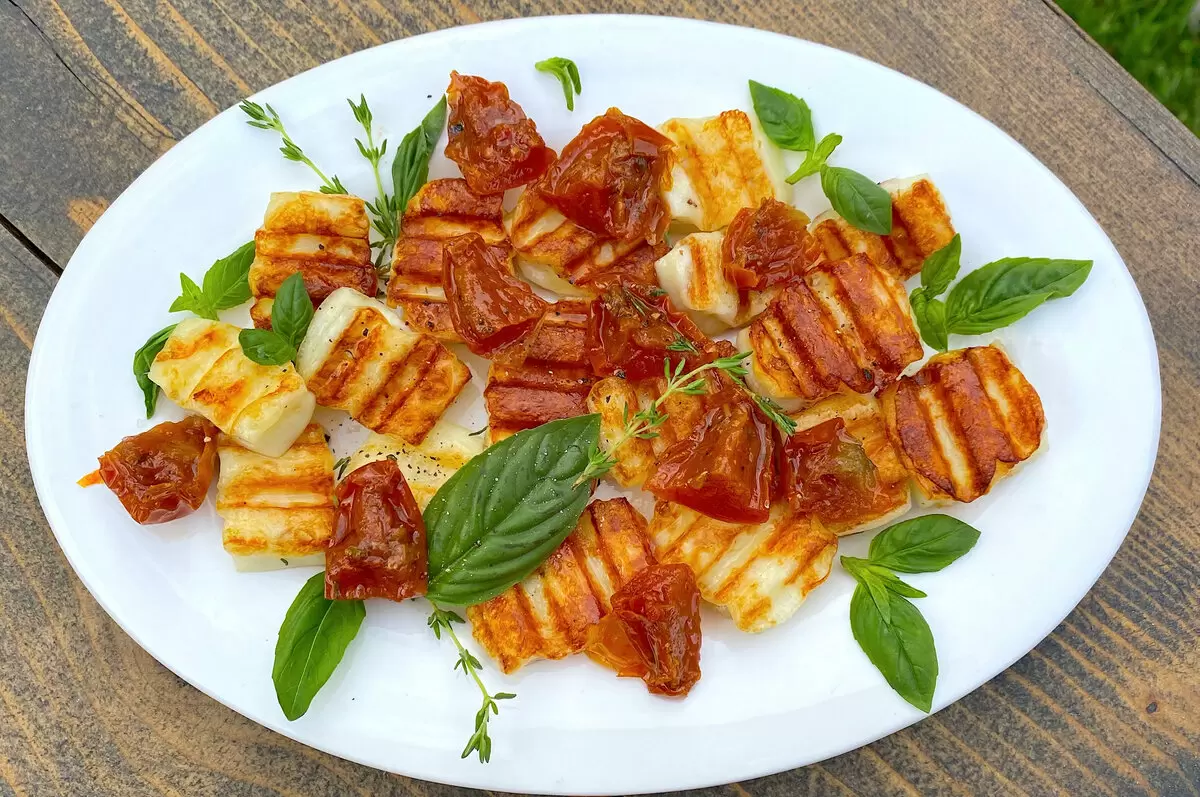 Жареный халумис превратился в полноценную закуску. Вот как его можно подать: сначала сыр обжаривается на гриле или в сухой антипригарной сковороде до золотистой корочки. После этого его выложили на тарелку и слегка приправили солью и перцем. Завершает блюдо вялеными томатами, свежим базиликом и немного тимьяна — сочетание получилось действительно удачным и вкусным.