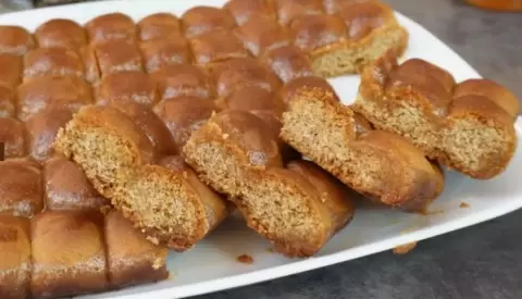Готовый пирог поливают горячим сиропом, чтобы он впитался и стал ещё более аппетитным. Разрежьте десерт, и подавайте его к чаю — это идеальное лакомство для всей семьи!