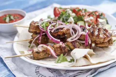 Пока шашлык готовится, займитесь овощами. Нарежьте помидоры дольками и огурцы брусочками. На тарелку положите лаваш, выложите на него готовое мясо и рядом разместите нарезанные овощи. Посыпьте их раскрошенной брынзой и подайте к столу с аджикой. Шашлык можно также приготовить на сковороде: разогрейте ее с растительным маслом, обжаривайте шпажки по 3-4 минуты с каждой стороны на сильном огне, а затем убавьте его и готовьте еще несколько минут до полной готовности.