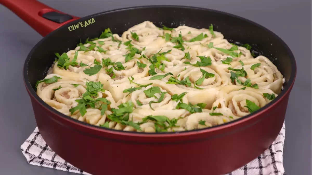 Рулет плотно сворачивают и делят на порции, потом готовят подливку. Замечательное сочетание получается из сметаны с добавлением воды и специй, а можно экспериментировать с томатной пастой или обжаркой лука и моркови. После этого рулетики обжариваются на сковороде и заливаются подливкой.