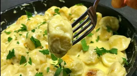 4. По желанию, посыпьте зеленью, и блюдо готово к подаче! Пробуйте и радуйте себя и своих близких вкуснейшими пельменями под нежным сырным соусом!