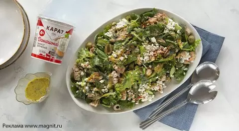 Салат с консервированной горбушей, творогом и укропом