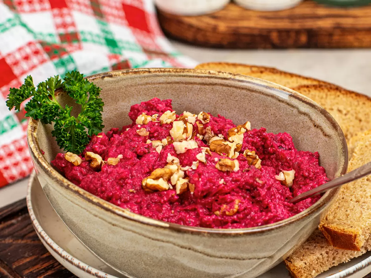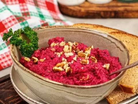 Если вам нужно быстро приготовить вкусную закуску, которая покорит сердца ваших близких, то свекольная намазка — это идеальный вариант. Вместо варки свеклы, используйте запекание: так яркость вкуса и насыщенность цвета останутся на высшем уровне. Это отличное сочетание варёного яйца и мягкого сыра, придающее блюду кремовую текстуру, а грецкие орехи и чеснок добавляют пикантности и насыщенности. Подобная закуска не только прекрасно подходит для буднего дня, но и станет настоящим хитом на любом праздничном столе.