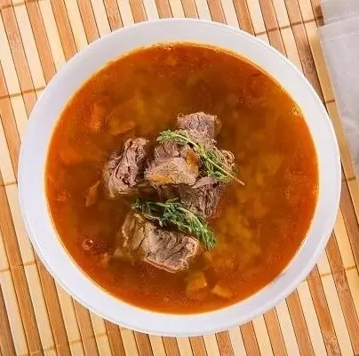 Разложить приготовленное мясо по тарелкам, налить горячий суп, добавить веточки тимьяна и подать на стол с подсушенным черным хлебом.
