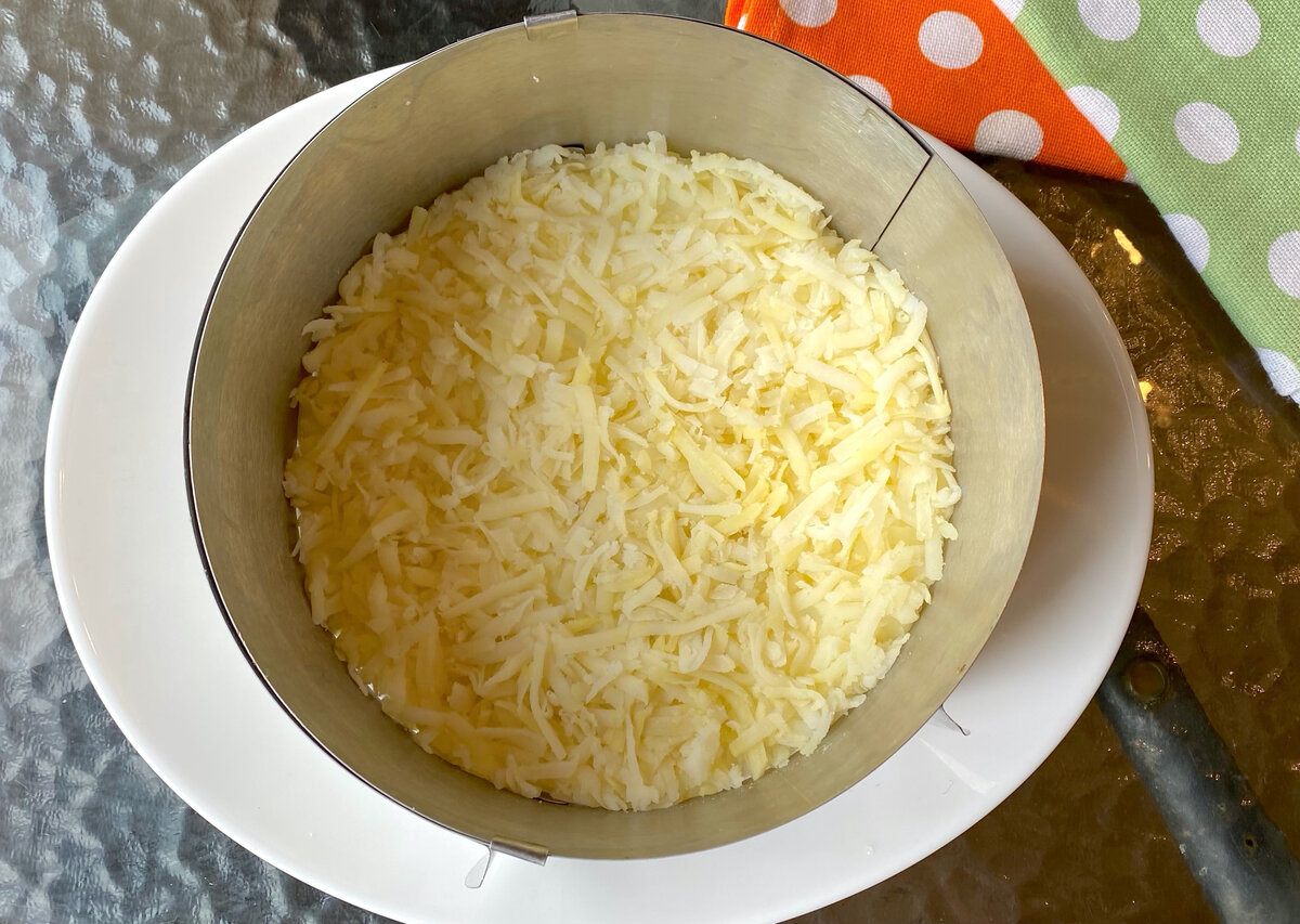 - Картофель натирается на крупной терке и становится первым слоем. Важно, чтобы слои были тонкими и не придавливались, так салат будет более вкусным.