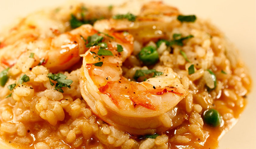 Ризотто подается на тарелке, вокруг которого располагаются креветки, поливая всё ароматным соусом. Это блюдо идеально дополняется свежим овощным салатом и бокалом белого вина. В результате получается настоящая кулинарная симфония, которая порадует даже самых требовательных гурманов.